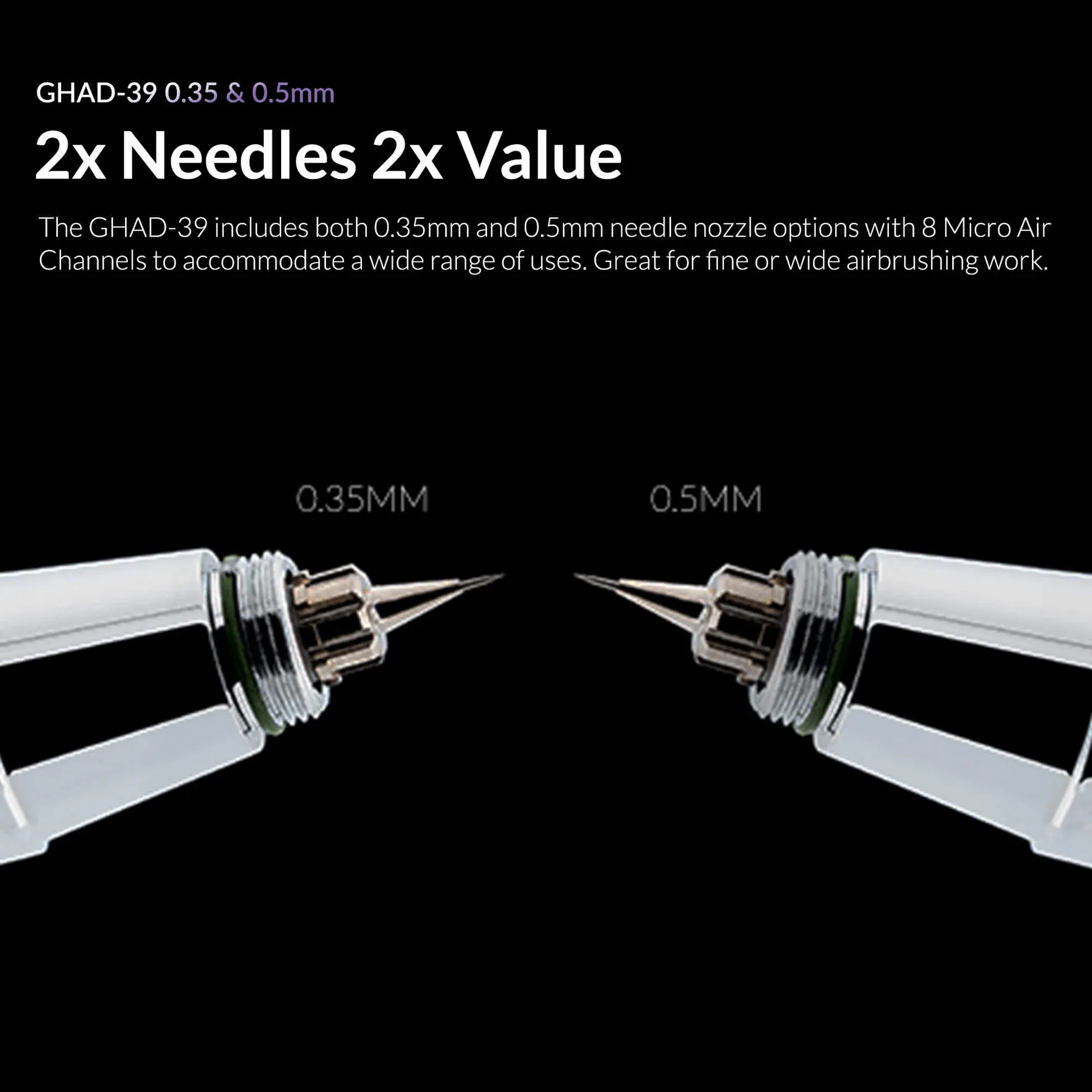 Double Needle, Double Value: With options for both 0.35mm and 0.5mm needle nozzles, along with 8 Micro Air Channels, the GHAD-39 is versatile enough to handle fine detailing or broader applications with ease.