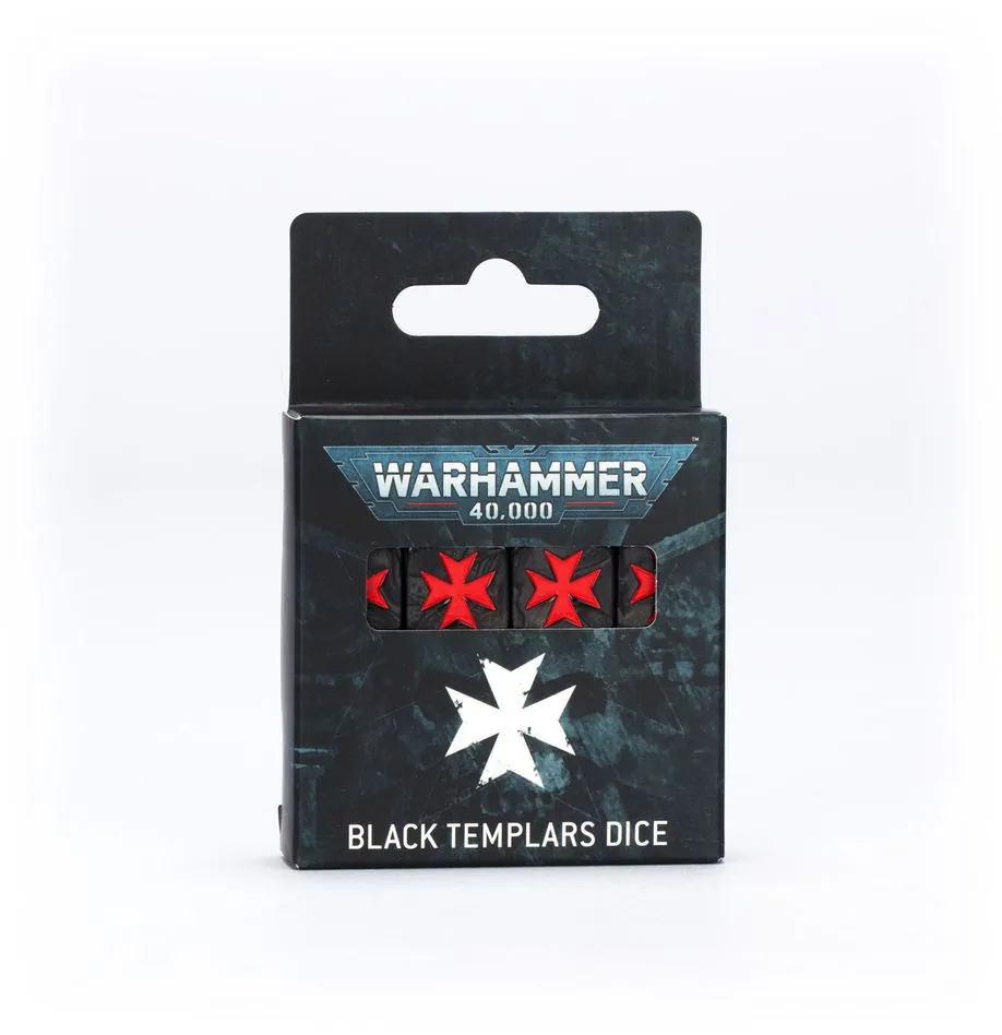 This is a set of 16 six-sided dice with squared edges for use in games of Warhammer 40,000, themed around the Black Templars. They are cast in pearlised black and grey swirl acrylic plastic with red ink markings, and measure 16mm along each edge. The 1-5 facings are traditionally pipped and each ‘6’ face is decorated with the faithful icon of the Black Templars.