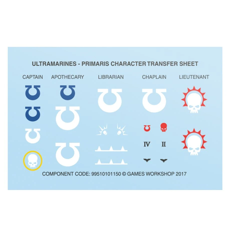 This kit contains 14 plastic components, 1x Citadel 40mm Round Hex Hole Base, and an Ultramarines Primaris Character Transfer sheet containing 21 high-quality waterslide transfers for you to decorate your miniature.