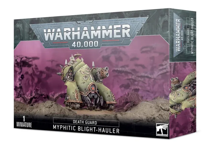 Powering into battle on a trio of articulated track units, the Myphitic Blight-hauler is a light Daemon Engine that provides the Death Guard with heavy firepower wherever it is needed. Resembling a Bloat-drone that has been stripped of its turbines, this strange machine has heavy weapons mounted on its carapace, and its rusting armoured plates can absorb impressive punishment – as can its blubbery exposed flesh-parts, which soak up appalling trauma.
