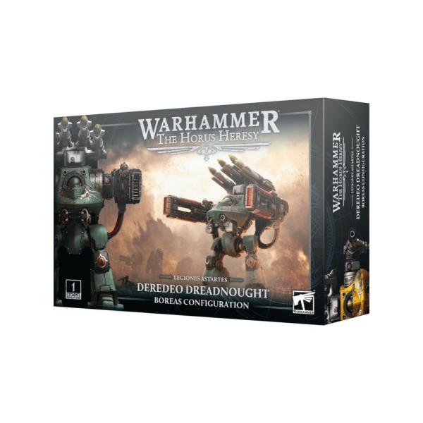 This multipart plastic kit builds a Deredeo Dreadnought in the Boreas configuration. This intimidating combat engine can be assembled with either a heavy-infantry shredding volkite falconet or an armour-killing Arachnus heavy lascannon battery for its primary, arm-mounted weapons, along with either twin-linked heavy bolters or twin-linked heavy flamers embedded in its torso. As if this wasn’t enough firepower, the walking gun platform also has four powerful Boreas air defence missiles mounted on top of its hull.