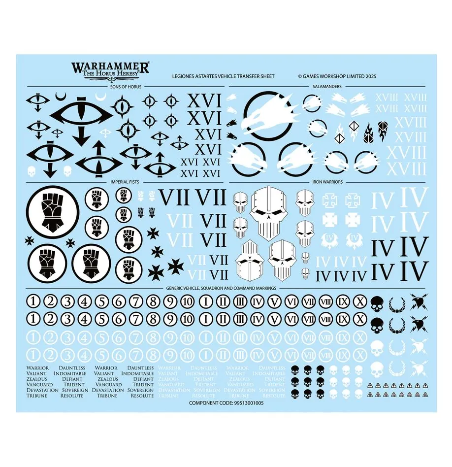 This kit comprises 89 plastic components, and 1x Legiones Astartes Vehicle Transfer sheet containing 288 high-quality waterslide transfers – featuring Legion iconography for the Sons of Horus, Imperial Fists, Iron Warriors, and Salamanders – to decorate your miniatures.