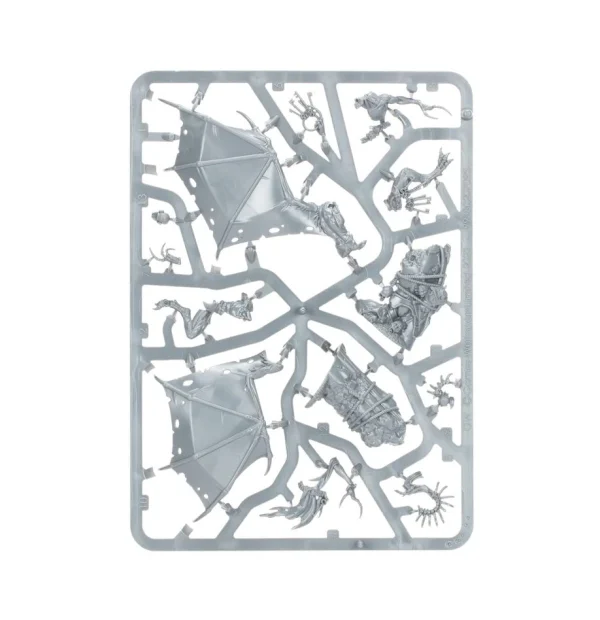 This multipart plastic kit builds an Abhorrant Gorewarden, a vampiric margrave from the Flesh-eater Courts. This terrifying gargoyle rides the winds of Shyish on bat-like wings, leaping from its crumbling perch to soar across the battlefield and seek out prey. Its monstrous form is adorned with a grisly parody of courtly regalia, and it clutches a set of keys in its razor-sharp talons – a symbol of its royal duty.